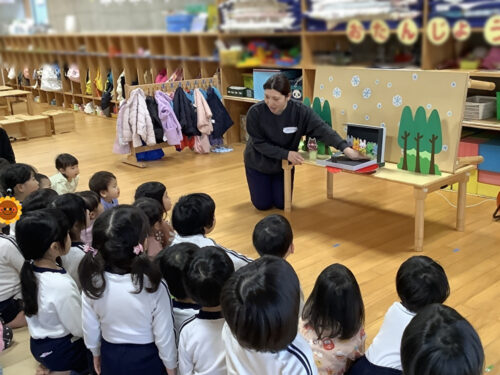 11月生まれと12月生まれのお友だちの誕生会では、冬のお話「てぶくろ」をスポンジシアターで楽しみました。次々に登場する動物たちに、子どもたちは目を輝かせながら見入っていました。 あたたかく、ほほえましい時間となりました。
