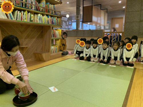 先生がお茶を点てるところを興味深く見つめ、お菓子もおいしくいただきながら、日本の伝統文化に触れるひとときとなりました。