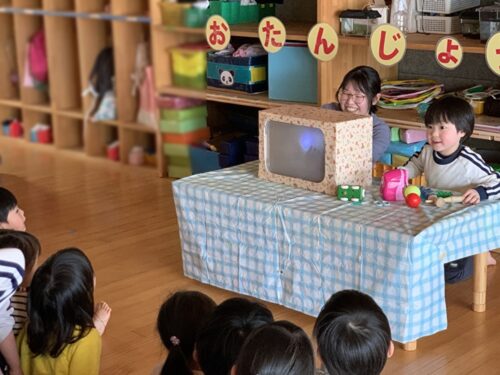 シルエットクイズでは、先生と誕生児さんが一緒に「これはなにかな?」と大盛り上がり!